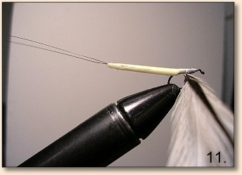 Намотайте торакс. Намотайте перо поверх торакса. Завершите мушку у колечка. Выщиплите или обрежьте бородки пера сверху и снизу цевья. |