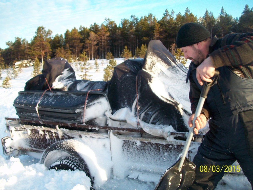 На 8 Марта решили поехать в Кузомень,порыбачить и поздравить супругу Власовича.Накануне Власович предупредил что ночью будет непогода,но разве нас что то может остановить?! Муж утром вышел посмотрел видно ли машину из под снега,посмотрел на моё выражение лица и сказал обреченно-поехали!До Кашкаранцев ехали по чьему то следу,видно что иногда копались люди,и вот мы их догнали-сидят крепко.Вытащили их,пошли вперёд,они за нами.Доехали до Точильной и всё. Дорога переметена капитально,а мы ещё с прицепом :-( Потихоньку,где копали,где топтали :-): Наконец встали совсем.Со стороны Варзуги тоже стоит машина, а между нами 150 метров перемёта,они сообщили что уже идёт трактор на помощь.Ходили друг к другу в гости. :-):