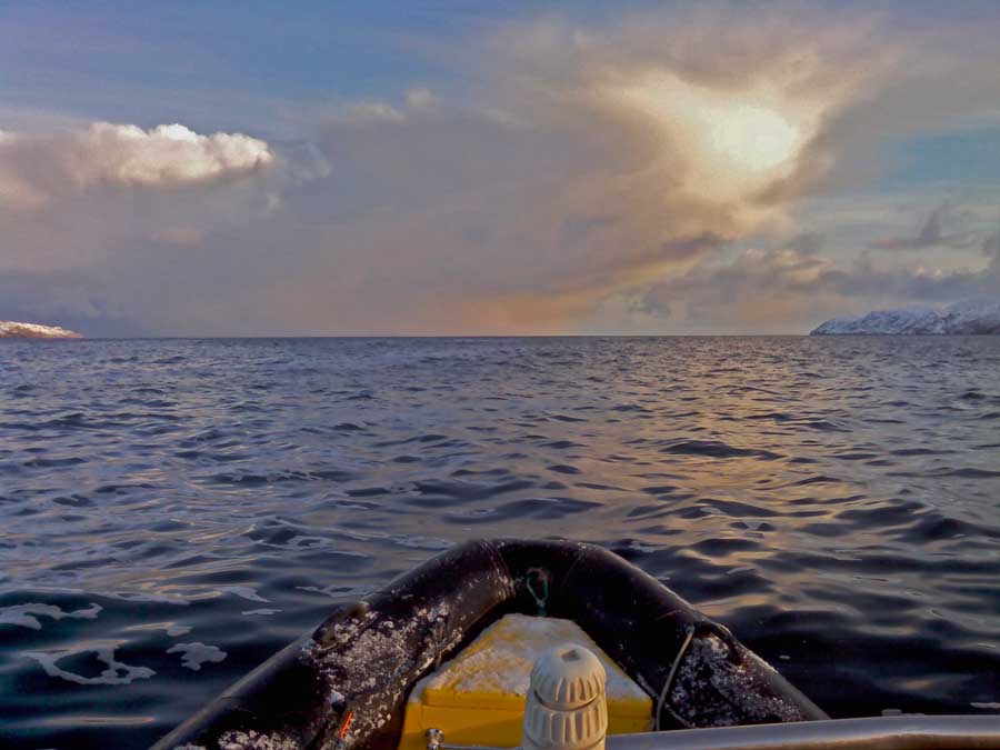 Снасть ложится почти горизонтально, весь шнур уже ушел в воду, а грунта что то не видать... Глядя на мои успехи, Сашка цепляет свою самую тяжелую железяку. 180 метров, рыбы нет. Навигатор прщуривает глаза на солнце. Мы не зговариваясь выбираем снасти и Сашка запускает движок. Терять уже нечего... Лодка скачет по волнам в темпе ,, позвоночник осыпался в трусы,, мы вылетаем к Погани. Сашка берёт мористее, лодка едва успевает остановиться, как он забрасывает свою гирю за борт. 220 метров. Сашка упрямо рвёт удилище раз за разом. НОЛЬ. Что дальше? Меня начинает загибать. Пробивает на зевоту, очень хочется спать.. Накат до 3 метров. Я с комфортом заваливаюсь в мокрый снег палубы, ногами в стамп, приладившись головой на носовой рундук. Сознание медленно меня покидает. Комок проскочил горло и вышиб головной мозг. В голове лёгкий звон и фарш из мозгов... Сашка зеленея с лица вежливо интересуется - Блевать будешь? Я проваливаюсь в сон, как медведь в берлогу... Сашка пинает мою ногу - Пошли в Лодейку, отстоимся немного.. Минутный сон принёс облегчение, я могу поднять голову. Сашка уже никакой. Ему тяжелее в сто раз, он не может ляпнуться на спину и всё бросить. Ветер усиливается, накат становится ещё жестче. Я изображаю руками полное согласие с доктриной Навигатора. Уже у Пушки мы немного приходим в себя, тут не так шкивает. Сашка пытается удержать внутри организма сьеденную колбаску. Я умываюсь забортной водой. За весь экстрим поймано 4 рыбины.. Чё? - Вопрос Сашки не вызывает никаких сомнений, ведь сказано же, что с Сети бежать домой ближе... - Пошли отсюда нах.., пока такая шара существует...