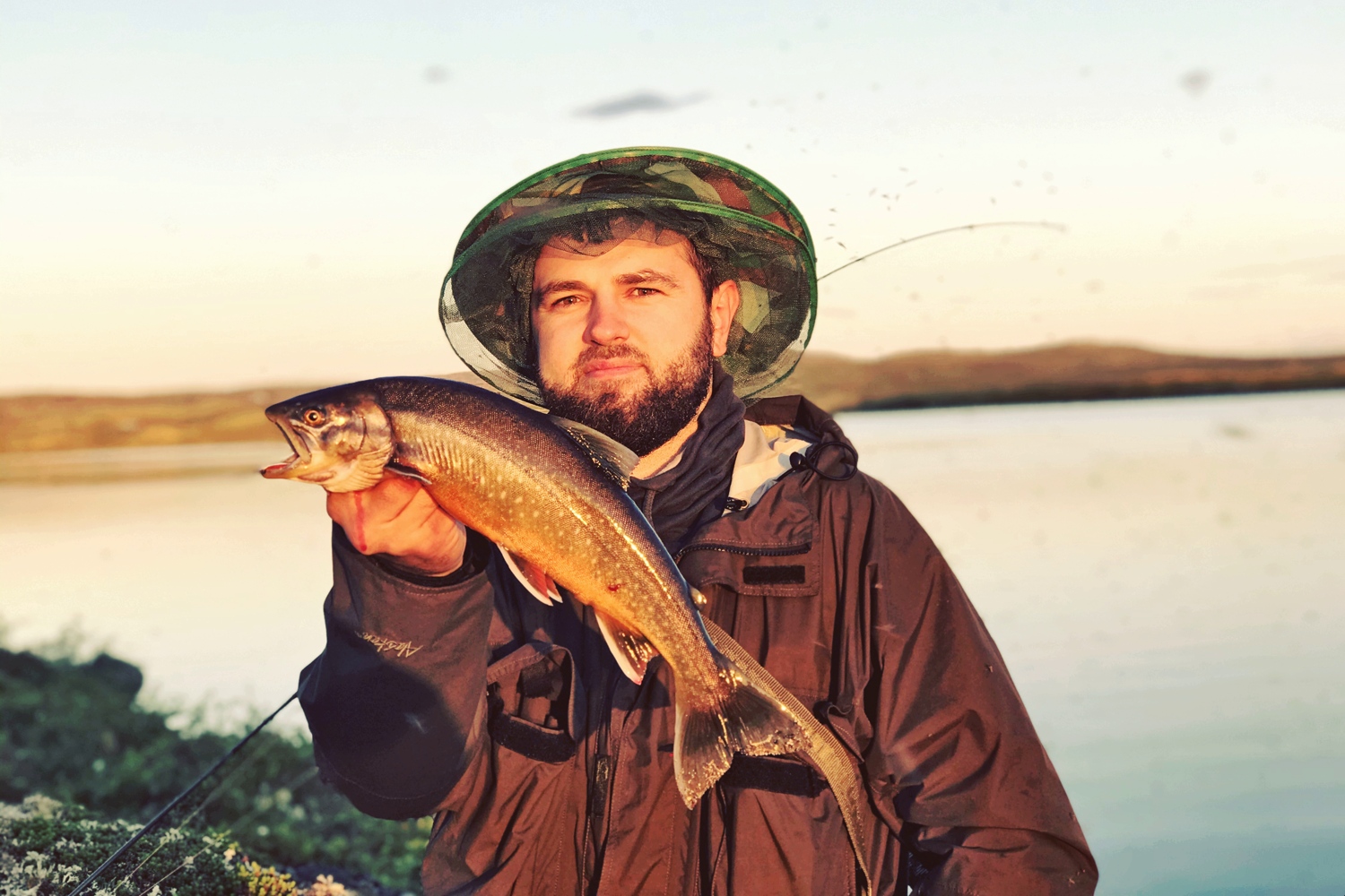 В итоге, не прошло и 10-ти минут как загиб, свечка, еще раз свечка... Приятная тяжесть, фрикцион включился... Подтянул поближе и увидел неплохую кумжу. Около лодки она порадовала нас своими танцами с кульбитами. Немного дали ей походить и аккуратно взяли ее подсачеком.