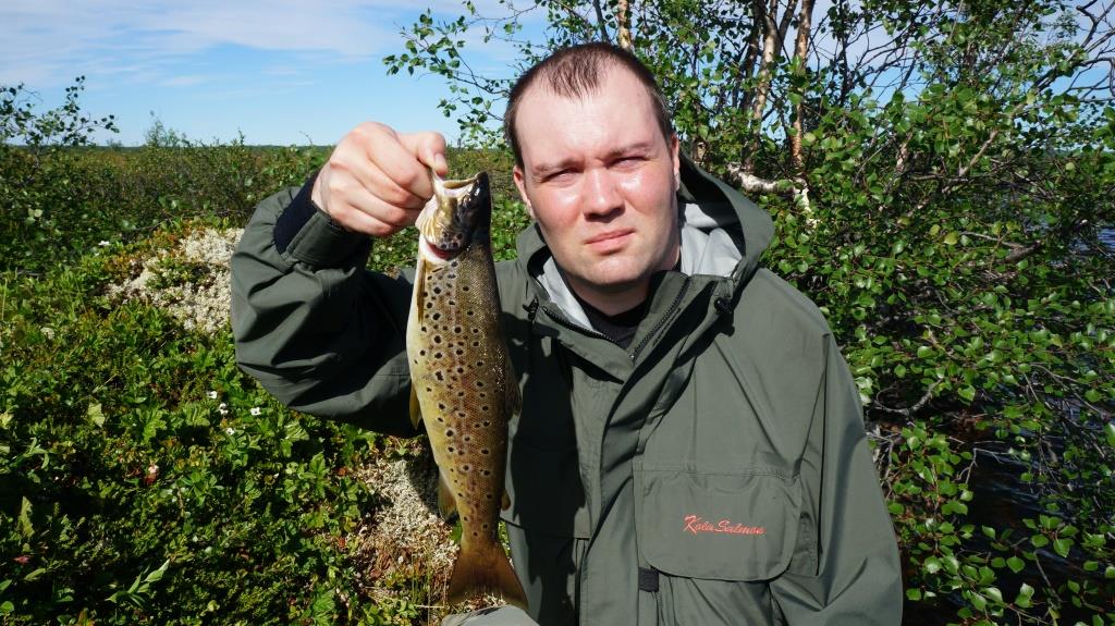 списали на то, что еще не выросли цветочки, по которым бегают букашки и поэтому рыба толи не активна, толи вообще её нет сейчас в озере. пошли вниз по ручьям и вот, наконец, Ваня вытаскивает свою первую кумжинку в этом сезоне