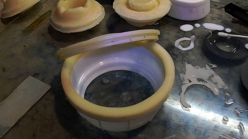 Все смазывается разделительным воском, что бы полиуретан не прилип к силикону. Матрица тоже составная, её (обе половинки) тоже обработать разделительным воском ..что бы не склеились.