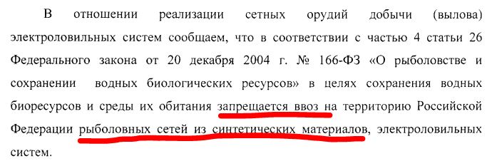 ФЗ 166 запрещает ввоз рыболовных сетей...а чем тогда торгуют повсеместно...сетями российского производства что ли или только из конопли?!