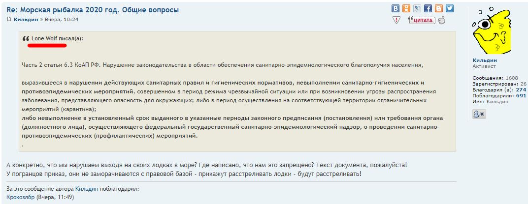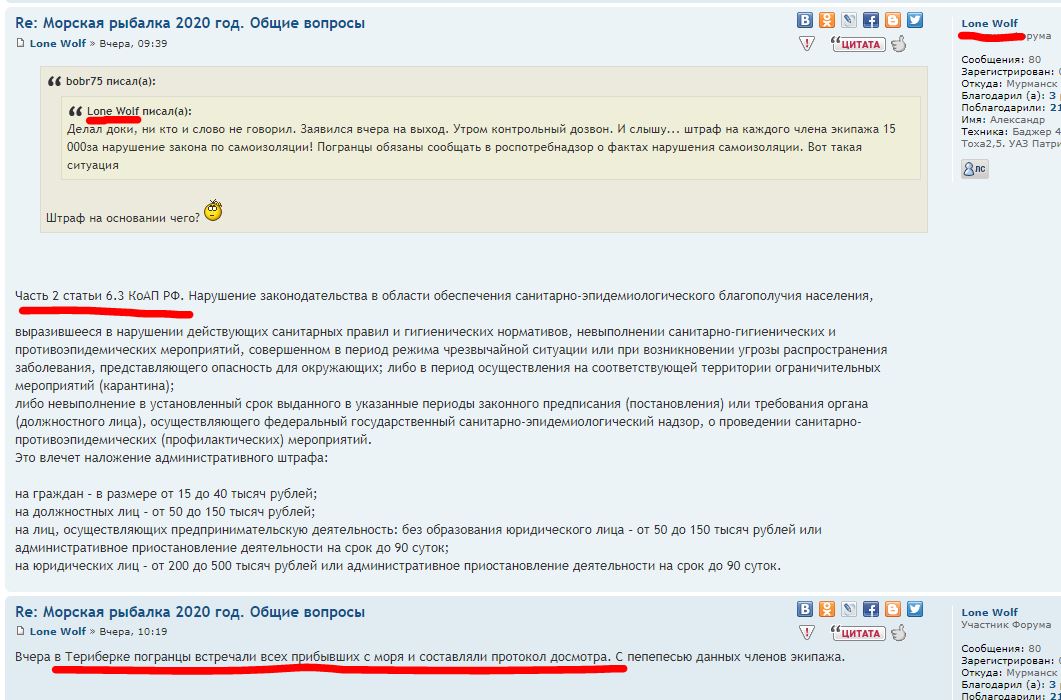 Морскую рыбалку", мля, почему и на каком основании пограничники составляют акты осмотра лодок, выходивших в море, и передают их в органы роспотребнадзора для дальнейшего привлечения к ответственности (штрафу в 15 тыров) всех членов экипажа этих лодок? Что конкретно они нарушили, выходя на своих лодках в море? Затупил, мля, совсем, думал в теме про "