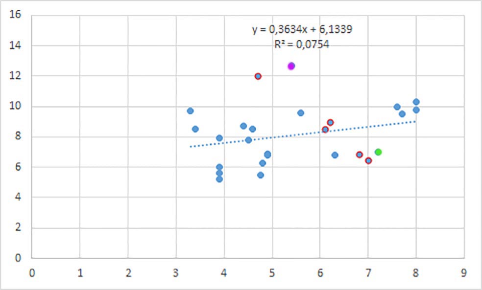 Наблюдаем весьма размазанное пятно точек, взаимосвязь гибкости-крутящего момента отсутствует. Что говорит о возможности создания любых вариантов. Т.е. остается вопрос выбора возможностей. Ну, допустим, примем за некий ориентир идол последних постов - модели гамакатцу (помечены красным). И? К примеру, в секторе высокой жесткости рядом с ними наличествует Karasu (зеленая точка) - она хуже или лучше подходит для серьезной рыбы? Или cовокупность характеристик T-Hunter (пурпурная точка) - лучше или хуже соседствующей рядом гамакатцу?