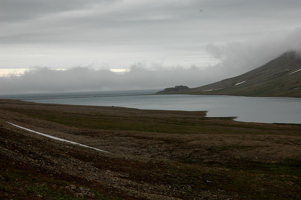 Имеем водоем в самой тундровой тундре, размещенный в горной котловине. Очевидно, что берега будут переходить в подводный склон такими же галечно-валунными россыпями, которые обычна сначала формируют прибрежную мелководную отмостку, которая далее переламывается на более крутой свал, которой на неком уровне переходит в заиленную чашу.
