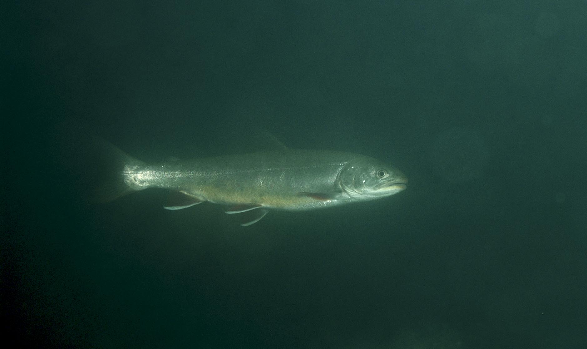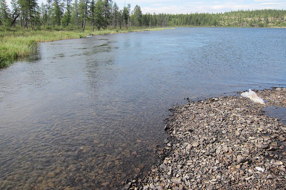 Дальняя от моря часть водоема - эт широкий мелководный разлив, практически лишенный каменистого грунта - только ооочень узкая полоска вдоль берега, а все остальное - заиленный песок. Голец, как правило, тут только транзитом. Основной обитатель - сиг-пыжьян, Но он тут сидит исключительно на моллюсках, которых вырывает из песка. Ловить - бессмысленно.