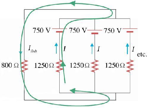 В данном случае представлены не все ряды, читатель может продолжить схему сам. Теперь, используя правило Кирхгофа, можно вычислить ток в каждом ряду, а также ток, проходящий через жертву. Отметим, что токи через каждый ряд эквиваленты.