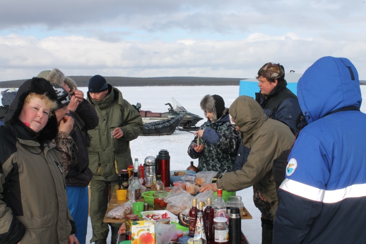 На льду озера,на том примерно пятаке где ловят корюшку(немного в сторонке, чтобы не мешать рядовым обывателям ловить свою рыбу), организовываем палаточный лагерь, выставляем флаг Мурман-фишинга, расставляем столы, мангалы, делаем большую поляну.