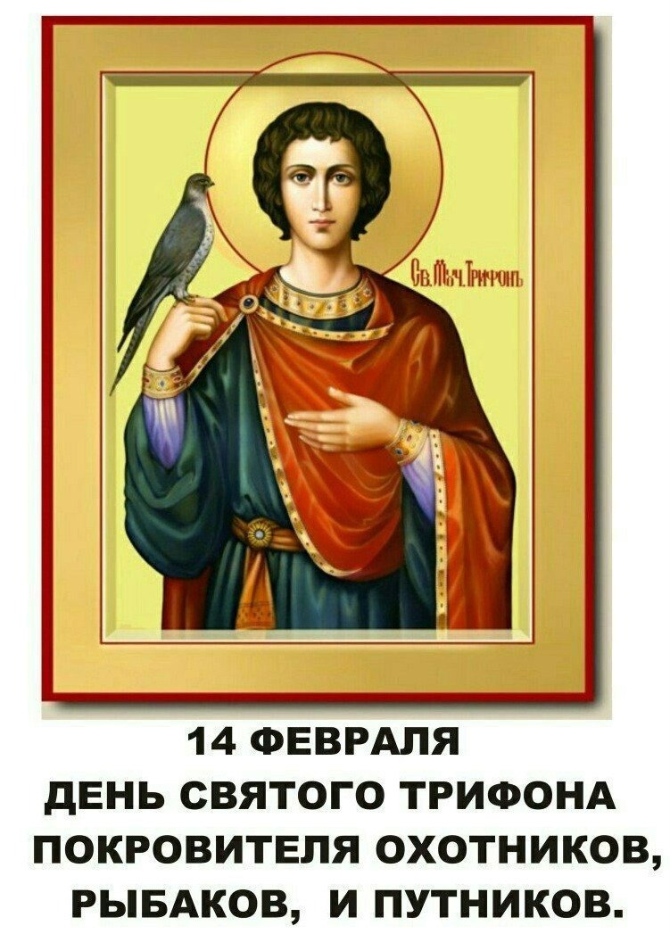 Согласно Житию, Святой Трифон с юных лет был распространителем христианской веры и прославился чудесами. У него был дар исцелять болезни, изгонять бесов. 14 февраля все православные россияне празднуют День Памяти Святого Мученика, имеющего в России особое поминовение, связанное с русскими охотничьими традициями.