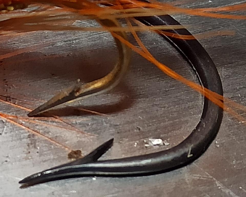 Короче, изначально-умозрительно я б склонялся к жалу, направленному к кольцу (головке) крюка. Прямому, без всяких изгибов. С короткой бородкой, отходящей от тела, видимо, не более чем толщину проволоки. Без каких либо радиальных изгибов в профиле крюка в районе жала-бородки. И может трехгранного профиля.