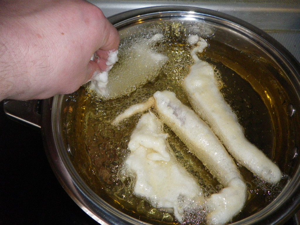 Температурную готовность масла определяю кинутой в него капелькой теста. Если оно тупо опустится на дно без всякого шкворчания и пузырьков, значит масло ещё недостаточно нагрелось, а если капелька теста будет вести себя в масле "весело", то значит всё пучском, и можно приступать.