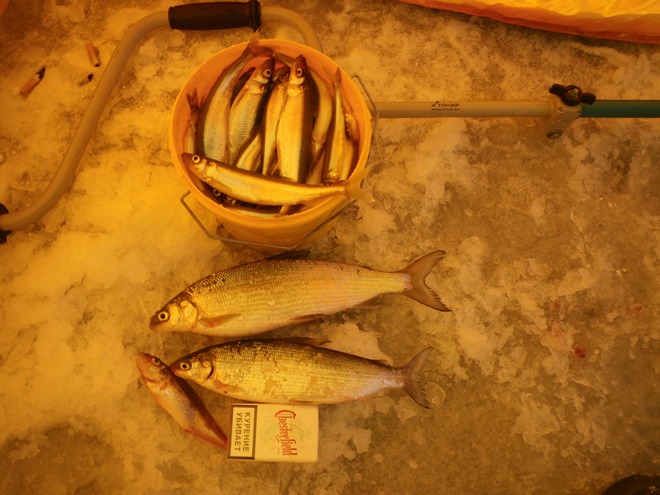 Клевало непрерывно, но очень много мелочи. Ловлю «на поплавок» и если бы реагировал на каждый «тюк», то её бы и натаскал, т.к. поплавок практически не стоял, поклёвок море. Ждал «до верного». Клевала в основном у дна, выше мелочь, а после 3-х метров вообще ни поклёвки. Палатку забыл в машине, вспомнил только спустившись - возвращаться «в лом», так что в конце начали немного подмерзать руки.