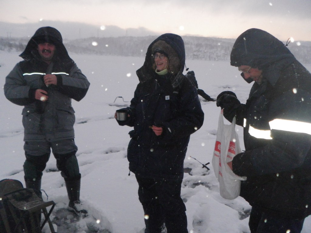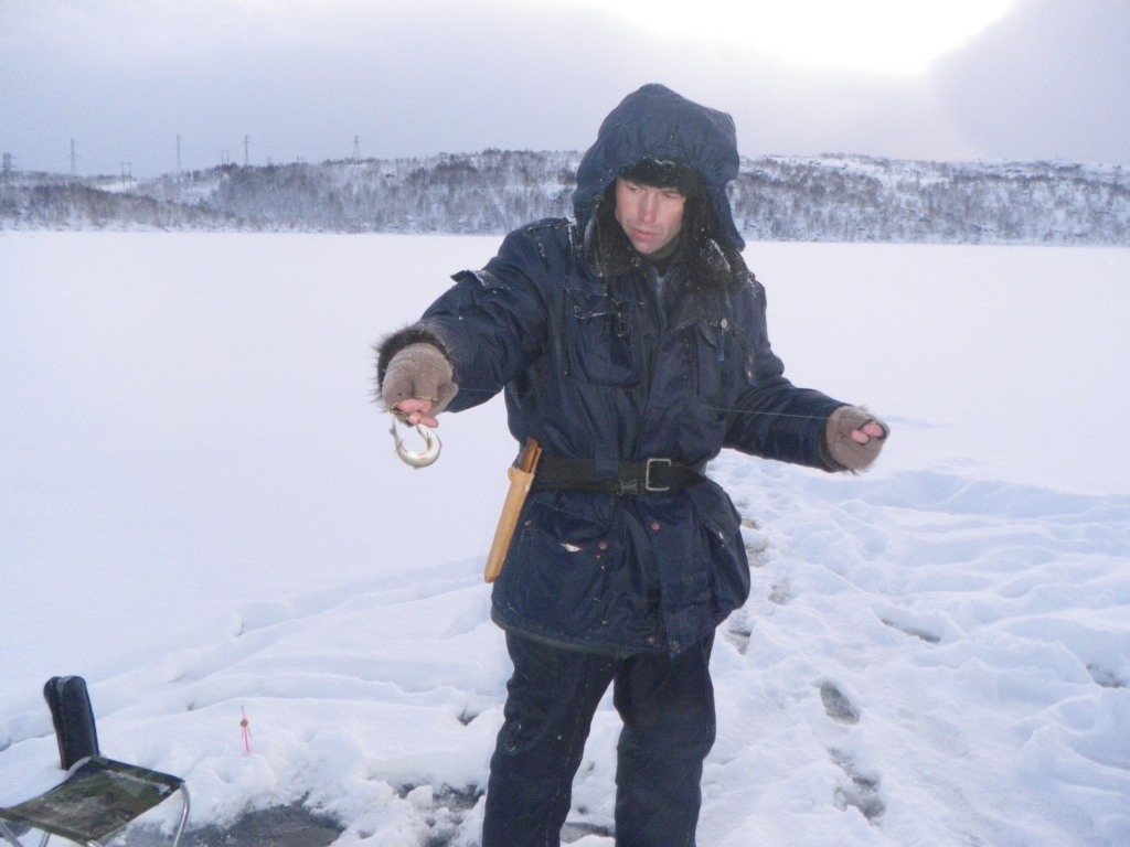 , поскольку все-таки не решились ехать куда-нибудь подальше без информации о состоянии льда. Результат - полтора десятка окуньков. Уже после того как сфотографировал улов, поймал небольшого налимчика. Лед - сантиметров 6-7, хотя ожидали гораздо большего.
