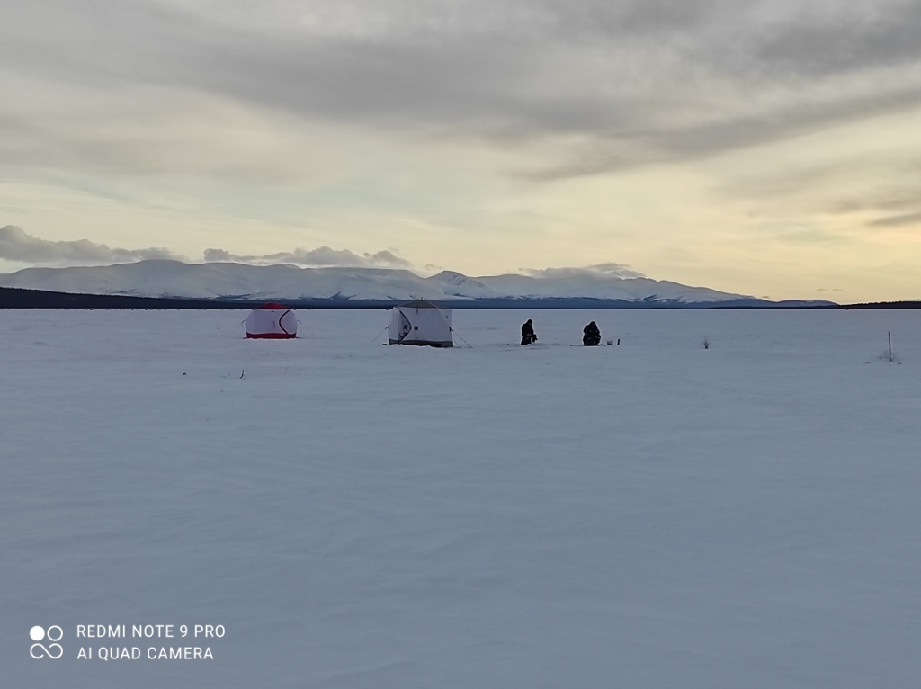 Солнышко вышло, тепло стало. Я вышел из палатки и решил что пойду рыбу искать. По радиусу метров 150 вокруг палатки прошел, просверлил 16 дырок, поймал пару штук и понял - сегодня нихрена не день Бэкхэма!