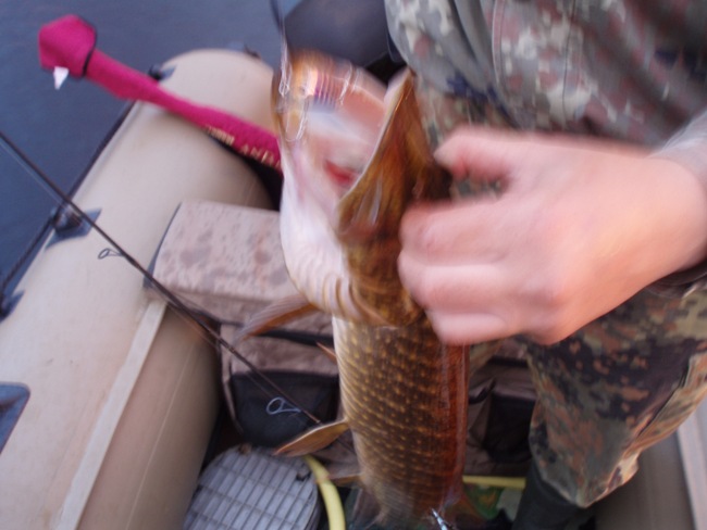 Ставили "кружки" ,но безрезультатно. ЗАто по окуню оторвались по полной! Брал активно и жадно и на червя, и на воблеры! На вторые сутки,вернувшись в лагерь,увидели сетевиков проверявших свои орудия лова.У них был довольно- таки мощный катер,стоявший у берега,а сами промышляли на резинке. На наше высказывание: ЗАчем сетей понатыкали везде? Видели же наш лагерь недалеко!" Блесну негде кинуть!" Ответ был: " Только окушки попадаются и рыбы мало,щук нет . Хоть на блесну ,хоть в сети!" И тут.... спустя пару минут Володя подсекает щуку,жаль они не видели! ВЫвод: " Спининг и удочка рулят!"