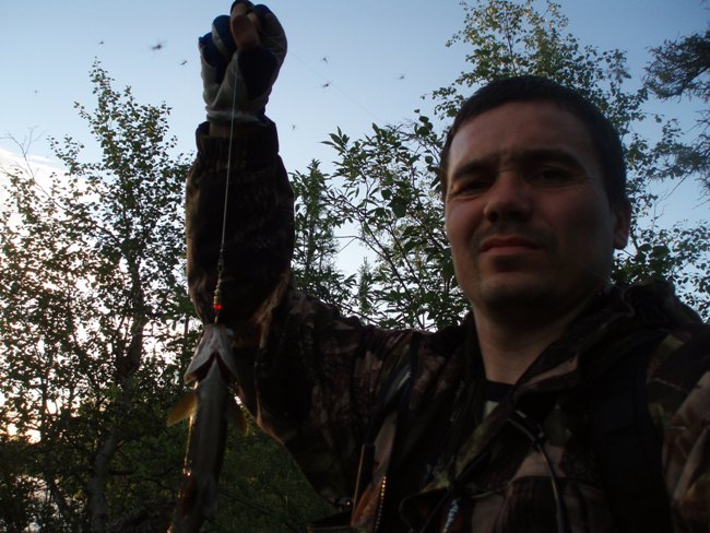 Можно конечно им было по рогам надавать,но связываться не охота. Вдруг оружие у них.Просто наглость их поражает,другие хоть тихорятся как-то. Вообщем настроение это нам подпортило,да и ветер поднялся,клёв прекратился. Мы решили попытать счастье в близ лежащих речушках,где ,хочется отметить, я поймал первого в моей жизни хариуса!