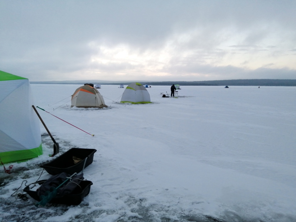 Поставили палатку. С 9ч (как пришли) и до обеда клевало весело с 2 м ото дна, хотя рыбу эхолот показывал и выше (там она не брала).