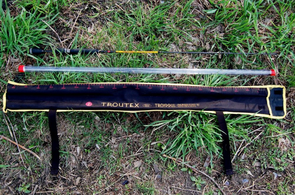 Итак, AIKO TROUTEX TRO 199UL. Чехол черного цвета с желтой каймой из очень плотного материала наподобие кордуры с линейкой внутри. Возможно именно с этой модели фирма AIKO стала комплектовать чехлы своих УЛ удилищ прозрачным пластиковым тубусом для предохранения вершинки от поломки. Застежки на липах – все удобно и функционально. Пришлось лишь вклеить поролон в верхнюю заглушку, чтобы он не вываливался.