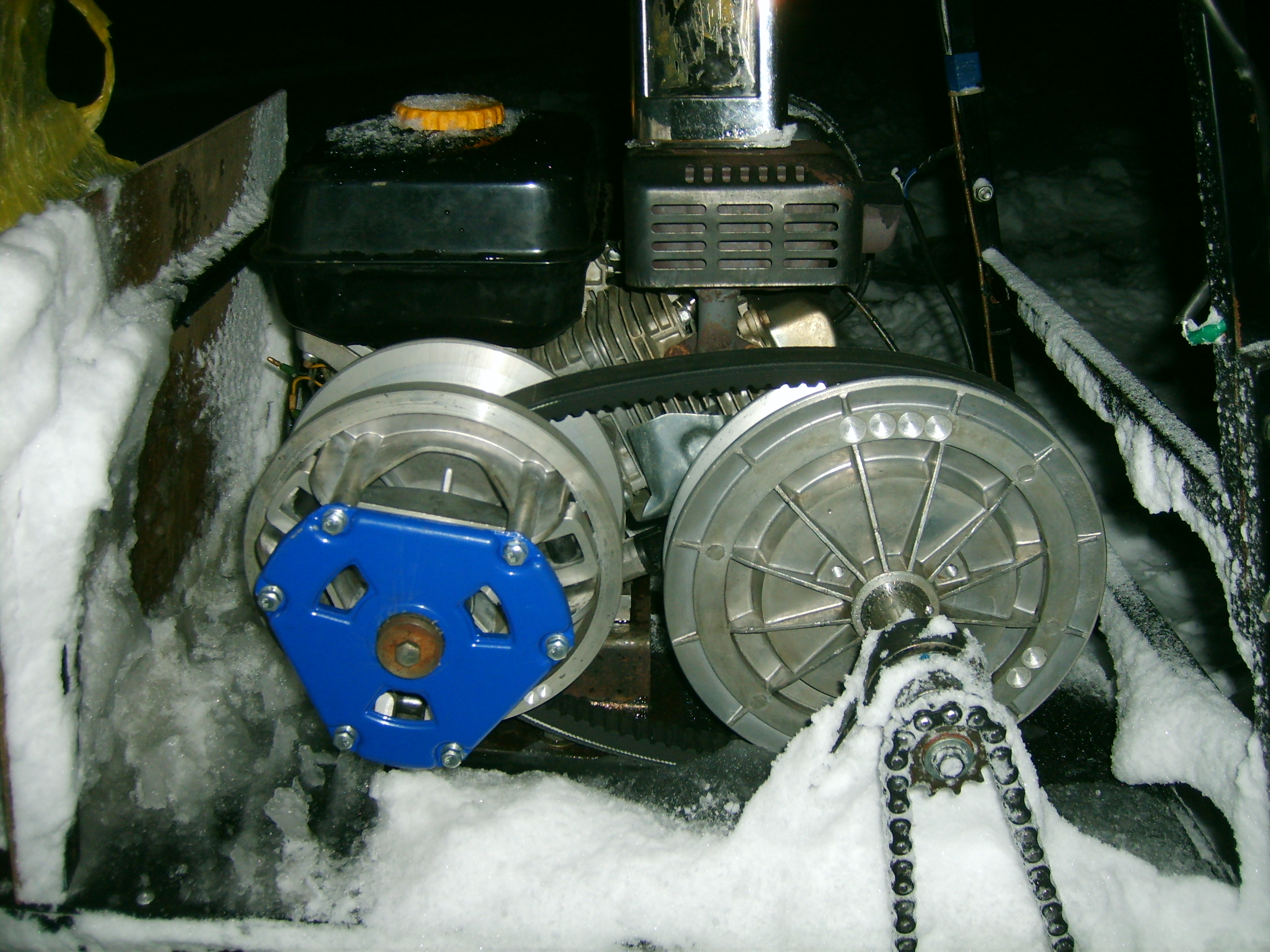 Привет всем любителям МБ! Я из Полярных Зорей. У меня РЕКС MTR500RV9 с китайским вариатором от мопеда. Этот варик китаёзы слизали с Американского Comet 30 серия.Ставится на двигатели от 2до 8 сил и применяется буржуями исключительно для колёсной техники(карты,мопеды)С этим вариком мопед разгоняется до 70км/час. На МБ он тоже раскручивается не плохо где-то 30км/час,но только по буранке. Пробовал ездить один по целине по озеру ложил на морду кусок рельсы что-бы не буксовала и вперёд.Скорость 5-8км/час если снег до 50см если больше МБ начинает заваливаться на левый бок ,чтобы так ездить бифштексы как у Шварца нужны. .Короче если брать РЕКС то на рыбалку по первому и по последнему льду,а также для передвижения по буранкам пойдёт и с вариатором и с автоматом ,а если по целине гонять то МБ с вариатором САФАРИ от бурана и с движком не мене 9 сил.Эта тема активно обсуждается на форуме любителей мотособак.Спецы говрят,что ставить САФАРИ на ДВС 6,5 сил нет смысла от 9 и выше. Я свой МБ эксплуатирую один сезон, езжу в основном один по Имандре по буранкам иногда вдвоём .При очень щадящей эксплуатации поменял один ремень вариатора, после уменьшения межосевого расстояния между валами (сдвинул движёк на 3мм. назад) второй ремень отходил сезон до конца износ не наблюдается.Родной тоже был перед выездом целый, но разлетелся вклочья на полном ходу. Выяснилось ,что при сильной натяжке на полном газу ремень на ведомом шкиве опустился чуть ниже клёпок,которыми прикллёпаны тарелки ведомого шкива вариатора (ремень не должен доходить до клёпок 2 мм) Похоже ремень начал тереться о клёпки ,начал лохматиться вылезли нитки и в итоге разорвало в клочья абсолютно целый ремень.Проверить натяжку ремня просто.Покатайте МБ взад вперёд руками,если ходит туго или вообще не катается(как было у меня) снимите ремень вариатора и покатайте ещё раз если стал двигаться легко однозначно перетянут ремень . Обведите вокруг подошвы ДВС маркером,чтобы осталась заводская установка и сдвигайте ДВС назад.Заводская установка по центрам валов 188мм,даже шаблон такой продаётся для МБ.Я выставил 185 и другим советовал изменения в лучшую сторону. Только не забудьте выставить шкивы соосно.Я выставлял при помощи ровного штапика.Кстате на форумах многие владельцы пишут ,что очень быстро изнашивается бронзографитная втулка вариатора-тоже результат перетянутого ремня.У меня эта втулка лопнула через месяц так и езжу без неё.Эта втулка нужна для того,чтобы когда МБ работает на холостом ходу ремень не терся об вал,я на холостом долго не стою прогрел пару минут и вперёд.Кто-то спрашивал про курок газа ,так сейчас ставят от бурана на новый РЕКС. Новый РЕКС теперь стал называться БАРС СЛЕДОПЫТ стоит ДВС МТР 9 сил и вариатор САФАРИ в Кандалакше видел и Мончегорске цена 68000т.р.