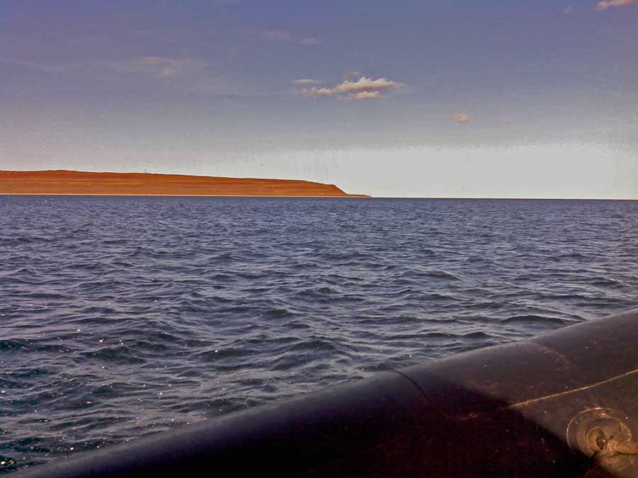 Относительно быстро пробиваемся в точку рандеву. По времени у нас запас примерно в час. Прибрались на палубе, подрезали рыбу, откачали воду. За приборкой неспеша перекусили. Саша тихо матюкнулся, глянув на часы. Экспедиционеры уже как пол часа должны были скучать на берегу... Все наши личные планы тихо сворачивались в трубочку и засовывались в тёплую дырочку. С учётом работы над ошибками Навигатор решительно двинул лодку к камням на краю песчанки. По его плану я должен был подвязать лодку на растяжку. С первого раза не получилось, но я таки выпрыгнул на камень более менее удачно.. Выплюнув весь песок изо рта, прополоскав солёной водой глаза и потирая ушибленную ногу я высказал Саше всё, что думал по поводу его командирских способностей и организационных навыков. Но дело сделано, Саше передан возвратный конец и лодка стала на отжимной ветер в метрах 10 от берега. Все эти подготовительные мероприятия безусловно сильно облегчали посадку наших экспедиционеров. Но вот только самих их по каким то причинам не было... Прикинув варианты и выбрав самый худший, мы решили, что Сашка будет с воды просматривать песчанку и камни, а я заберусь на скалу, посмотреть на всё это безобразие сверху. Сидеть на берегу было просто невыносимо. Но жажда действий покинула меня уже через 200 метров. Передвигаться по берегу в поплавке было невыносимо жарко... На скалу я залез с языком на плече и свёрнутым подмышкой поплавком. Через минут сорок на горизонте показались рыбачки. Шли они не оттуда и не туда... И даже невооруженным глазом было видно, что спирт у них только что закончился. После моих криков и маханий поплавком на вершине скалы парни наконец то взяли правильный курс и цепочкой посайгачили по тундре чуть бодрее.