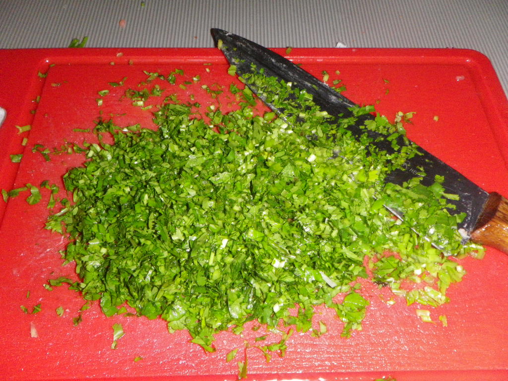 Потом берем лук, половину трём на терке, вторую половину мелко-мелко ножиком рубим, туда же несколько зубчиков чеснока и много кинзы. Тоже мелко фигачим на досочке.
