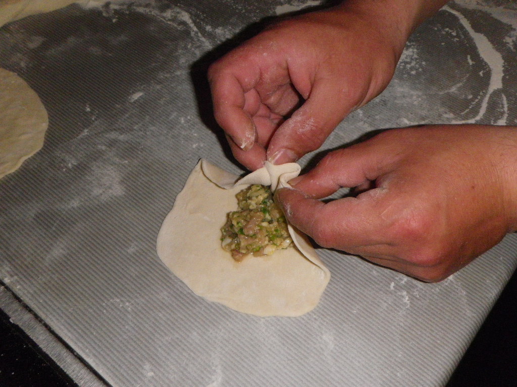 Ну и начинаем формировать складочки, придерживая верхушку хинкалины пальцами одной руки, а другой добавляя складки теста. По кругу в общем собираем по краям тесто вверх