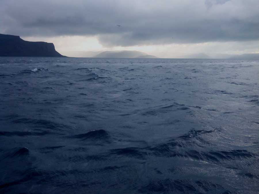 Вершины острова тщательно обмотаны слоями плотного тумана. Остров неприветлив и суров до безобразия. Мы на полусогнутых подкрадываемся поближе к нему.. Погода таки тётка ведьмоватая - от чего убежали, к тому и пришли.. Свинцовый туман над головой, мёртвая вода за бортом. Что клевать не будет, я вижу и так. Но мы пробуем... Как в унитазе. А я ж вам говорил! Сматываю удочку и осматриваю виды вокруг. Остров просто давит своей суровостью и неприступностью... Южак стаскивает с него тёплое покрывало низкой облачности и остров недовольно щерится осыпями камней. Соболь натужно ревёт дизелями где то в салме. К нам подкрадывается выкрашенный в грязно белый цвет катер с туристами. Туристы как овцы стоят на корме в новеньких жилетиках и с живым интересом таращатся на нас во все глаза. Толкаю Сашку локтем: - Прикинь, Сань! Мы АБОРИГЕНЫ!!! Саша рычит и делает непристойные жесты руками, но почему то мне, а не туристам. Аааааа.... Это он оказывается про рыбалку.. Сашка выбирает снасти, мы подходим к Кайману тёзки и держим худсовет.. Можно конечно дёрнуть на Восток салмой. В плане ведьмоватой тётки это куда как более перспективно. Но вот туристы, дай Бог им ярких впечатлений, пришли как раз оттуда. И про рыбу спрашивали у нас. Ну, так нам на Север... Засупониваемся под шелест Хонды и Саша задвигает сектор газа вперёд на треть. Под ложечкой начинает привычно посасывать. По воде, из под рваного неба на нас наползает ветровая рябь, вперемешку с дождём.. На Северном небольшая волна и классический Гольфстрим. Со стороны Тиберды уверенно тянутся рваные облака огромными кучами. Напротив маяка уже есть пара лодок. Алюминиевый Вельбот жмётся к берегу. Вторую лодку почти не видно, чёрточка на горизонте.. Перекинувшись с Лакостой парой идеек, занимаем позицию мористее, оставляя тёзке малые глубины. Саша выравнивает положение лодки по маяку и мы с надеждой забрасываем удочки...