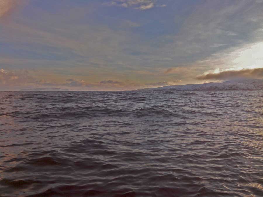 Снасть ложится почти горизонтально, весь шнур уже ушел в воду, а грунта что то не видать... Глядя на мои успехи, Сашка цепляет свою самую тяжелую железяку. 180 метров, рыбы нет. Навигатор прщуривает глаза на солнце. Мы не зговариваясь выбираем снасти и Сашка запускает движок. Терять уже нечего... Лодка скачет по волнам в темпе ,, позвоночник осыпался в трусы,, мы вылетаем к Погани. Сашка берёт мористее, лодка едва успевает остановиться, как он забрасывает свою гирю за борт. 220 метров. Сашка упрямо рвёт удилище раз за разом. НОЛЬ. Что дальше? Меня начинает загибать. Пробивает на зевоту, очень хочется спать.. Накат до 3 метров. Я с комфортом заваливаюсь в мокрый снег палубы, ногами в стамп, приладившись головой на носовой рундук. Сознание медленно меня покидает. Комок проскочил горло и вышиб головной мозг. В голове лёгкий звон и фарш из мозгов... Сашка зеленея с лица вежливо интересуется - Блевать будешь? Я проваливаюсь в сон, как медведь в берлогу... Сашка пинает мою ногу - Пошли в Лодейку, отстоимся немного.. Минутный сон принёс облегчение, я могу поднять голову. Сашка уже никакой. Ему тяжелее в сто раз, он не может ляпнуться на спину и всё бросить. Ветер усиливается, накат становится ещё жестче. Я изображаю руками полное согласие с доктриной Навигатора. Уже у Пушки мы немного приходим в себя, тут не так шкивает. Сашка пытается удержать внутри организма сьеденную колбаску. Я умываюсь забортной водой. За весь экстрим поймано 4 рыбины.. Чё? - Вопрос Сашки не вызывает никаких сомнений, ведь сказано же, что с Сети бежать домой ближе... - Пошли отсюда нах.., пока такая шара существует...