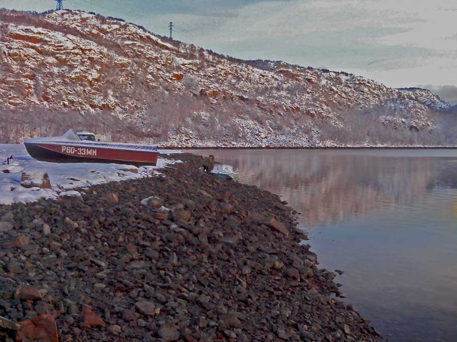 Снасть ложится почти горизонтально, весь шнур уже ушел в воду, а грунта что то не видать... Глядя на мои успехи, Сашка цепляет свою самую тяжелую железяку. 180 метров, рыбы нет. Навигатор прщуривает глаза на солнце. Мы не зговариваясь выбираем снасти и Сашка запускает движок. Терять уже нечего... Лодка скачет по волнам в темпе ,, позвоночник осыпался в трусы,, мы вылетаем к Погани. Сашка берёт мористее, лодка едва успевает остановиться, как он забрасывает свою гирю за борт. 220 метров. Сашка упрямо рвёт удилище раз за разом. НОЛЬ. Что дальше? Меня начинает загибать. Пробивает на зевоту, очень хочется спать.. Накат до 3 метров. Я с комфортом заваливаюсь в мокрый снег палубы, ногами в стамп, приладившись головой на носовой рундук. Сознание медленно меня покидает. Комок проскочил горло и вышиб головной мозг. В голове лёгкий звон и фарш из мозгов... Сашка зеленея с лица вежливо интересуется - Блевать будешь? Я проваливаюсь в сон, как медведь в берлогу... Сашка пинает мою ногу - Пошли в Лодейку, отстоимся немного.. Минутный сон принёс облегчение, я могу поднять голову. Сашка уже никакой. Ему тяжелее в сто раз, он не может ляпнуться на спину и всё бросить. Ветер усиливается, накат становится ещё жестче. Я изображаю руками полное согласие с доктриной Навигатора. Уже у Пушки мы немного приходим в себя, тут не так шкивает. Сашка пытается удержать внутри организма сьеденную колбаску. Я умываюсь забортной водой. За весь экстрим поймано 4 рыбины.. Чё? - Вопрос Сашки не вызывает никаких сомнений, ведь сказано же, что с Сети бежать домой ближе... - Пошли отсюда нах.., пока такая шара существует...