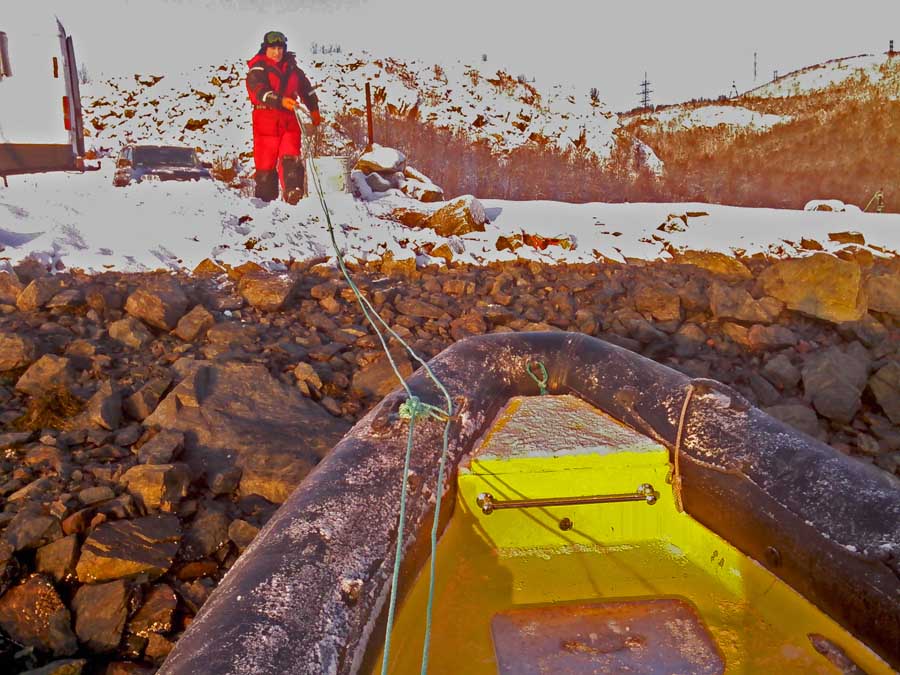 Снасть ложится почти горизонтально, весь шнур уже ушел в воду, а грунта что то не видать... Глядя на мои успехи, Сашка цепляет свою самую тяжелую железяку. 180 метров, рыбы нет. Навигатор прщуривает глаза на солнце. Мы не зговариваясь выбираем снасти и Сашка запускает движок. Терять уже нечего... Лодка скачет по волнам в темпе ,, позвоночник осыпался в трусы,, мы вылетаем к Погани. Сашка берёт мористее, лодка едва успевает остановиться, как он забрасывает свою гирю за борт. 220 метров. Сашка упрямо рвёт удилище раз за разом. НОЛЬ. Что дальше? Меня начинает загибать. Пробивает на зевоту, очень хочется спать.. Накат до 3 метров. Я с комфортом заваливаюсь в мокрый снег палубы, ногами в стамп, приладившись головой на носовой рундук. Сознание медленно меня покидает. Комок проскочил горло и вышиб головной мозг. В голове лёгкий звон и фарш из мозгов... Сашка зеленея с лица вежливо интересуется - Блевать будешь? Я проваливаюсь в сон, как медведь в берлогу... Сашка пинает мою ногу - Пошли в Лодейку, отстоимся немного.. Минутный сон принёс облегчение, я могу поднять голову. Сашка уже никакой. Ему тяжелее в сто раз, он не может ляпнуться на спину и всё бросить. Ветер усиливается, накат становится ещё жестче. Я изображаю руками полное согласие с доктриной Навигатора. Уже у Пушки мы немного приходим в себя, тут не так шкивает. Сашка пытается удержать внутри организма сьеденную колбаску. Я умываюсь забортной водой. За весь экстрим поймано 4 рыбины.. Чё? - Вопрос Сашки не вызывает никаких сомнений, ведь сказано же, что с Сети бежать домой ближе... - Пошли отсюда нах.., пока такая шара существует...