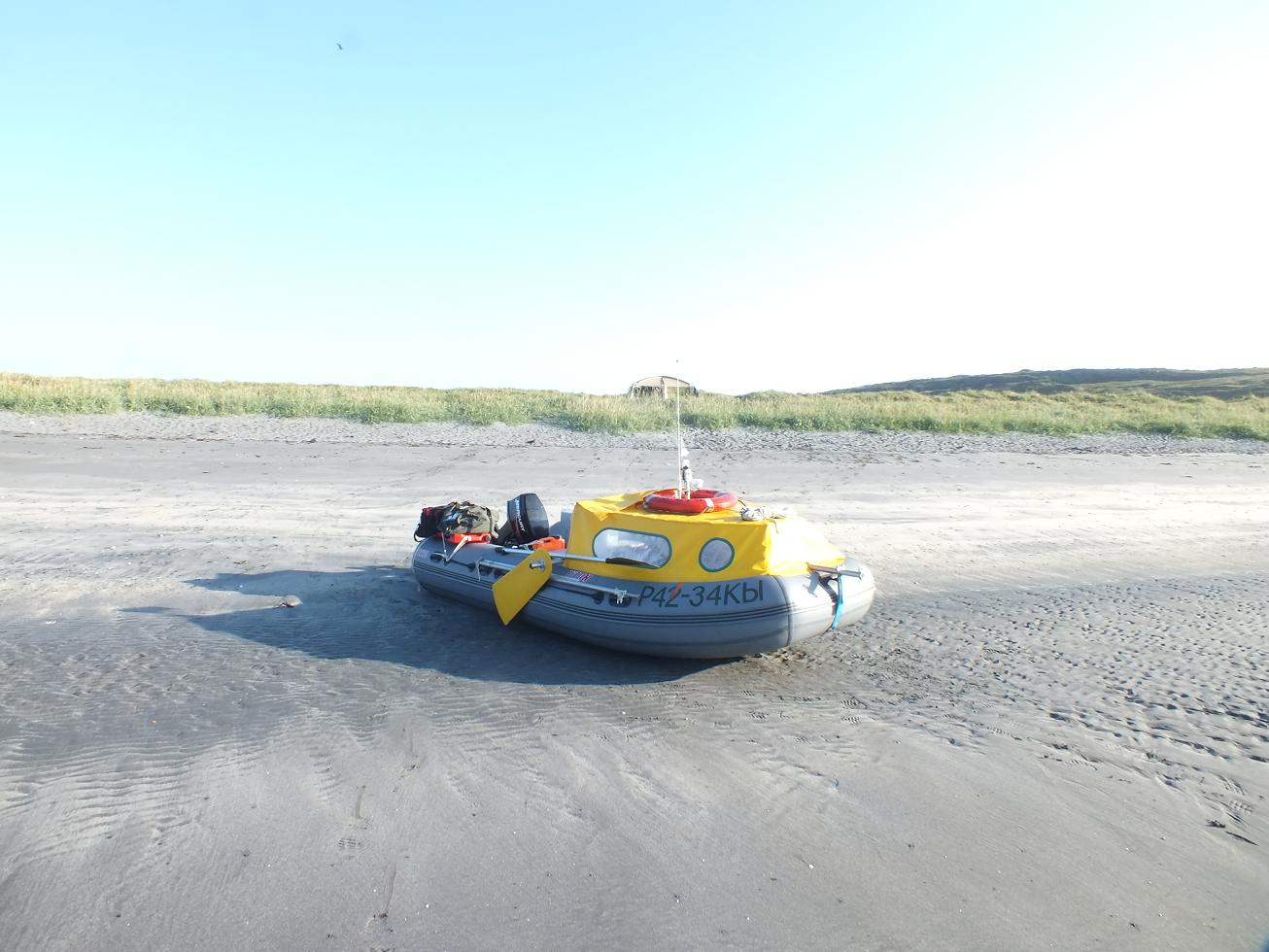 - Идём до мыса Немецкий, до мыса Немецкий (дублируя важные фразы, как в стародавние времена при плохой связи) и там первая ночёвочка. Обязательно доложимся вам о стоянке по связи.