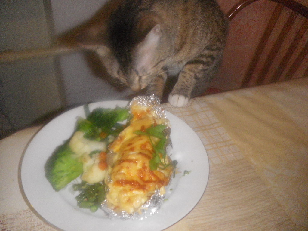 ну а так иногда тырит что-то.. мясо, курицу.. очень любит сыр.. причем от хохланда плавленного до дорогущих твердых сортов.. от креветок пищит..