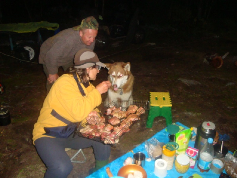 Хочу сказать пару слов о наших замечательных мужьях: с утрица, как мы все проснулись, позавтракали и нам предстояли кропотливые сборы на недельную рыбалку-озеро за 45км на квадр-ах, нам с Рыбулей мужья любезно предложили убраться с глаз долой до вечера, чтобы не мешали: подготовку техники, укладку прицепов и т.д. они взяли на себя. Мы же, пока они не передумали, быстренько слиняли на рыбалку на нашу реку. Взяли чекушечку коньячка, закусончик и бегом на лодку. Благо-всё рядом, снасти всегда в лодке, бак с бензином полный - ВПЕРЁД за впечатлениями. Вдвоём с Рыбулей на лодке, да ещё и клюёт - сиг, хариус до1кг, да ещё и под рюмашку за водяного… Думаю, каждый знает-кайф, жизнь удалась, что отчётливо отражается на наших лицах…..