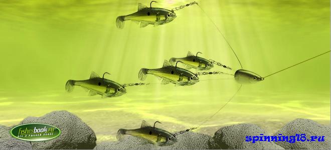 на дорожку и/или на троллинг снастью, под названием «Алабамские зонтики», состоящую из пяти приманок, в числе которых четыре без крючков и одна с крючком?