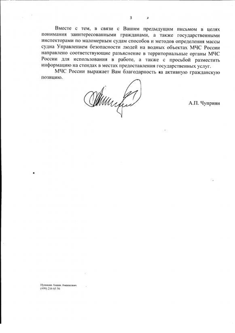 Больше сказать нечего. Это мне ответил этот Чуприянов, я писал и бодался с ними 10 лет в составе других инициаторов со всей россии и масквы. В результате чего собственно и родился этот ФЗ36. Целью было отмена регистрации всех ПВХ лодок Байдарок и катамаранов. Мы добились своего. Возглавлял всю эту группу Менделевич С.В. редактор газеты Вольный Ветер в маскве.