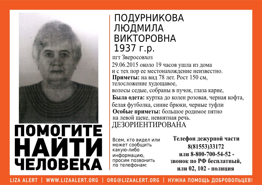 Помогите найти! Это моя мама , у неё плохо с памятью! я обошла посёлок спрашивала бабушек, детей,расклеила листовки но пока ни какой информации! Она хорошо помнит животных которые у нас были ! Собака джуля и кот фунтик он и сейчас есть! Мой телефон 89508962108 Юля