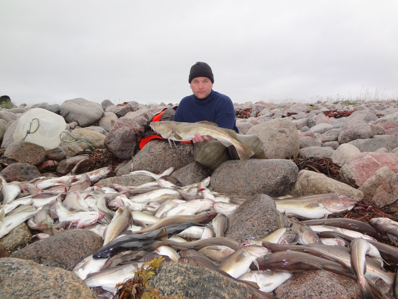 В итоге рыбалка трудовая, по рыбе у каждого шкереной за 15+ кг на человека, был даже тот у кого шкеренной под 30-ку получилось, но он был единственный)))трески процентов 70 улова, остальное пикша, другой рыбы вчера не было