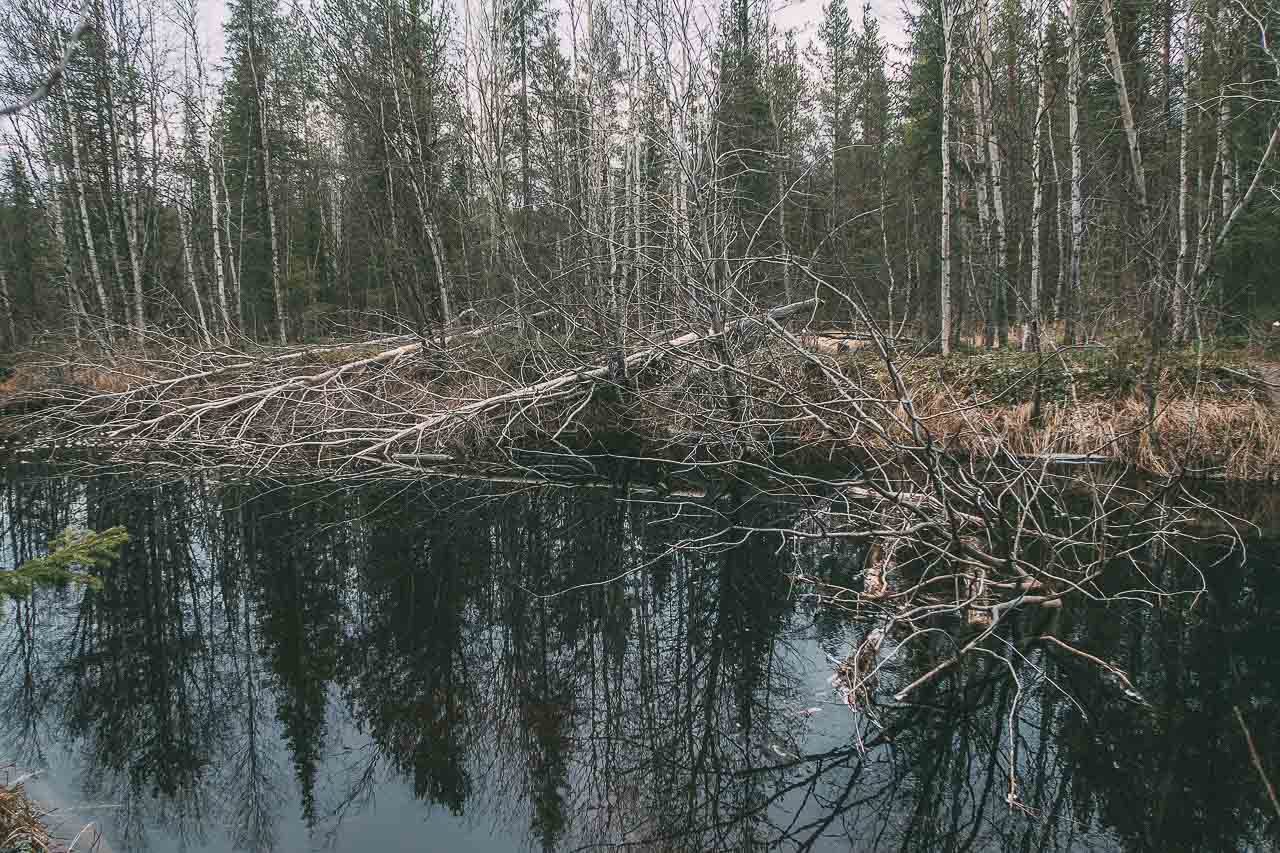 Ещё три недели назад на этом месте все деревья были целые, но с приходом заморозков, бобры начинают активно заготавливать себе запасы на зиму - результат на фото. Несколько десятков деревьев повалены вдоль ручья, образовав завалы.