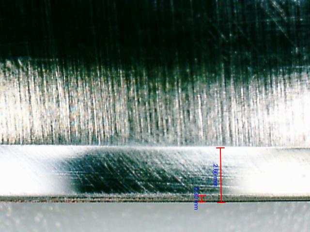 Вот так сейчас выглядит подвод ножа Browning. Микроподвид режущей кромки 40 градусов. Общая ширина подвода 3,30 мм, С 2,21 мм начал менять углы микроподводов - на ширине 1,10 мм использованы камни 3000,4000,8000 и финальный микроподвод натуральным камнем шириной 0,10 мм, тобишь шириной около одного плюс половина человеческого волоса.