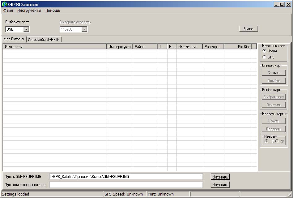 Скачиваем, запускаем. Если язык интерфейса не устраивает, выбираем другой. Выбираем параметры и раставляем галки, как у меня. Правда, если навигатор со встроенной памятью, и карты в ней, источник надо выбрать GPS. Натравливаем на файл GMAPSUPP.IMG, где он там у нас лежит. Жмем кнопку Список карт - создать.