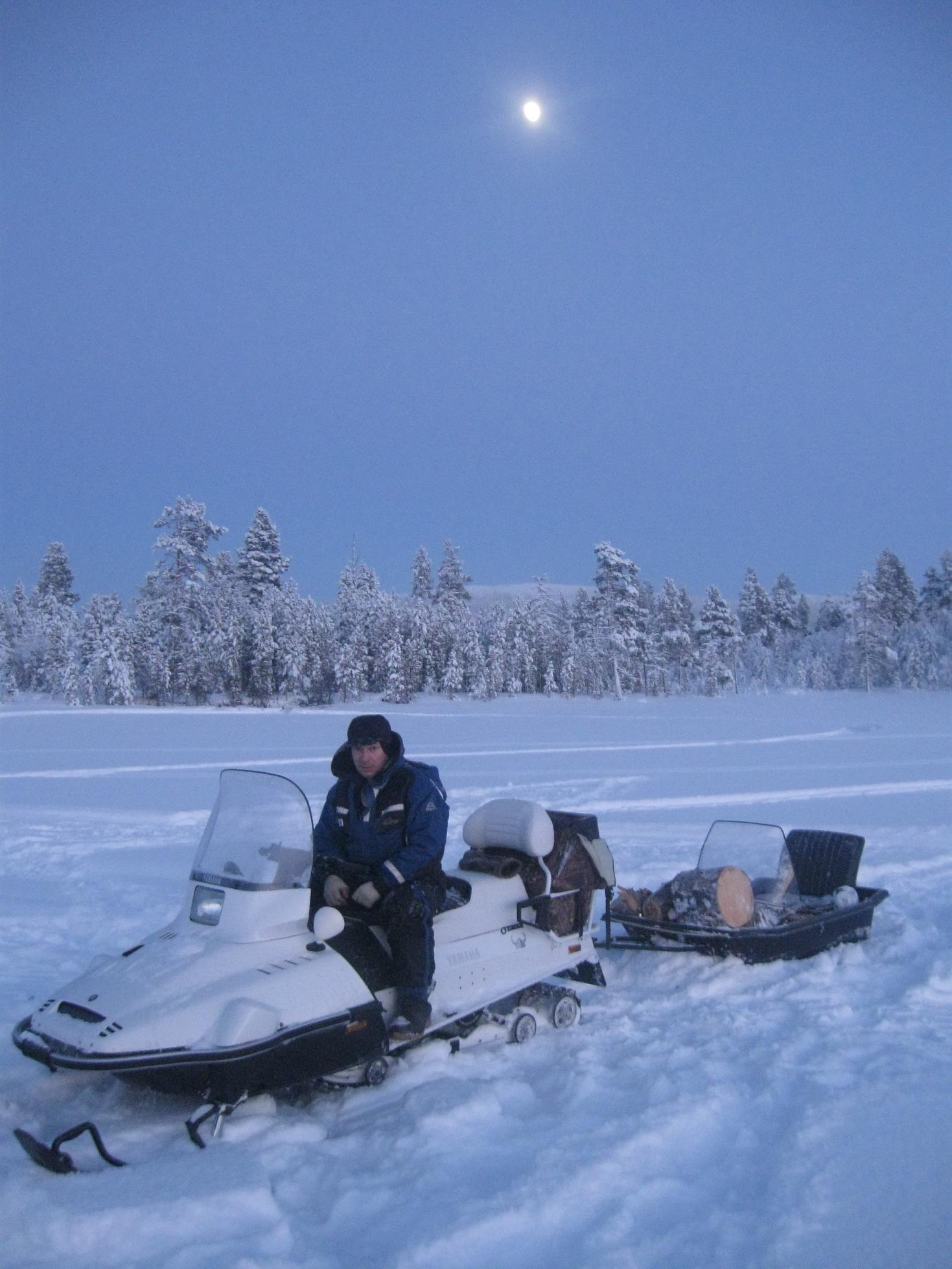На берегу примечаем неплохую сушинку.Миша валит её.Укладываем в волокуши напиленные чурбачки.