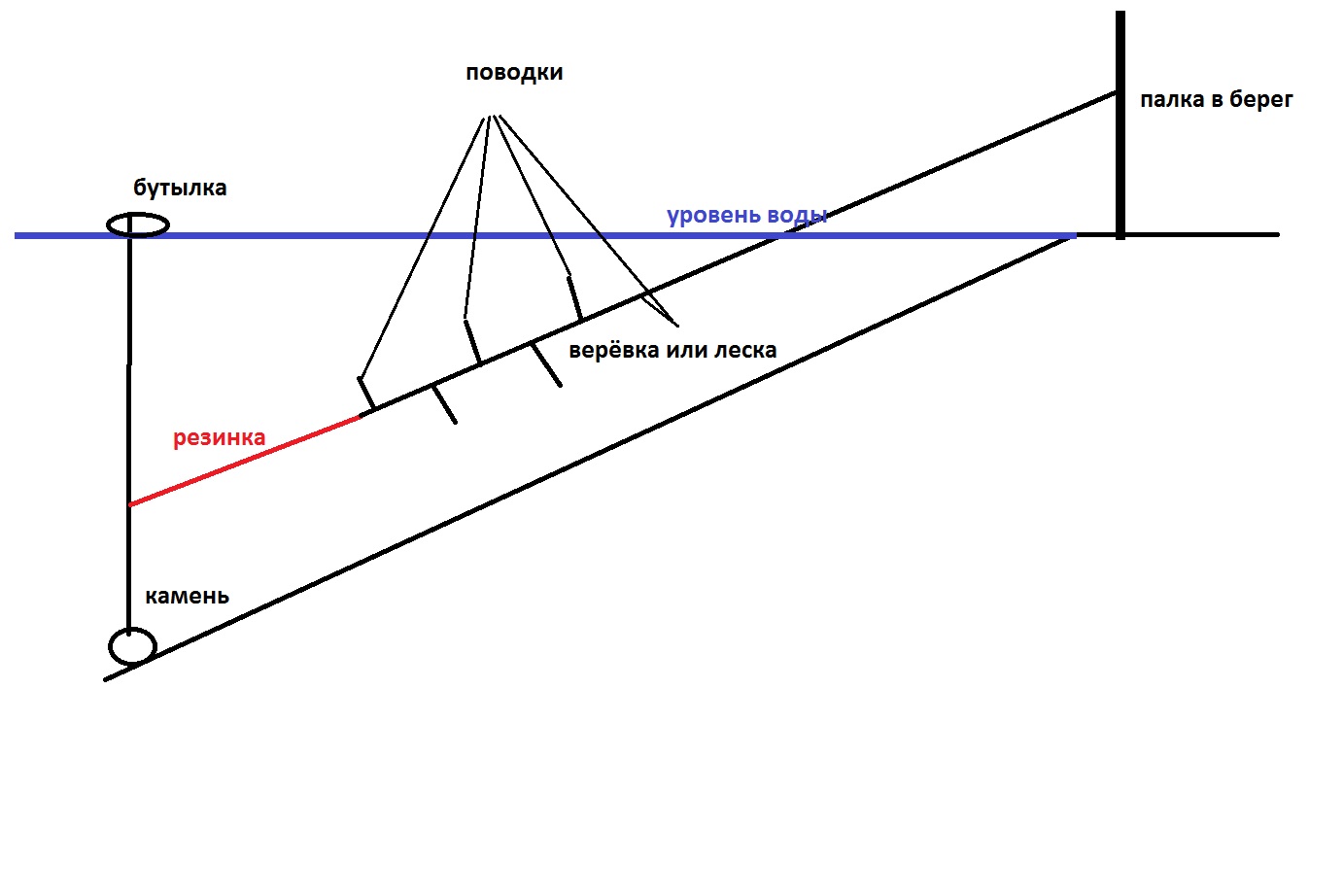 Была у нас и ещё одна снасть - резинка. Кто-то скажет не спортивно. А мне было интересно. Я заранее сделал несколько поводков типа "гитара". Удобная, скажу я вам снасть. К этим поводкам приладили поводок из лески см 10 и крючок. Наживку на него и в воду. Получилось у нас 7-8 таких поводков.
