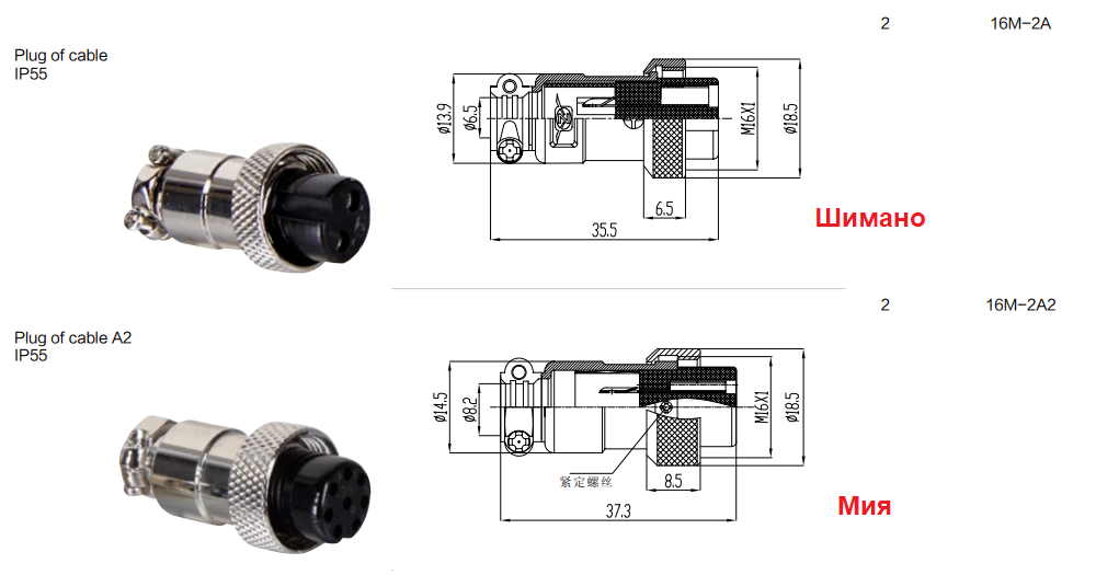 У Шиман есть два вида. Два штырька - резьба гайки М16, есть пять штырьков, хитрый разъем (питание два толстых) - резьба М16. Диаметр разъема 12.5 мм