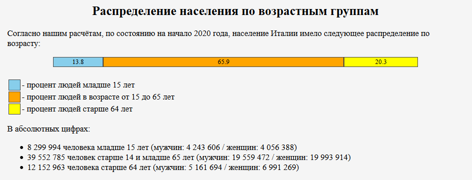 В Италии проживает большое количество людей преклонного возраста, так как в стране довольно низкий уровень рождаемости. Средний возраст мужчин в Италии составляет 79.1 лет, женщин 84.3 года.Низкий уровень рождаемости одновременно с увеличением продолжительности жизни сформировали в Италии феномен стареющей нации. Жители Италии, родившиеся в 60-х годах прошлого века, составляют самую большую возрастную группу в стране.