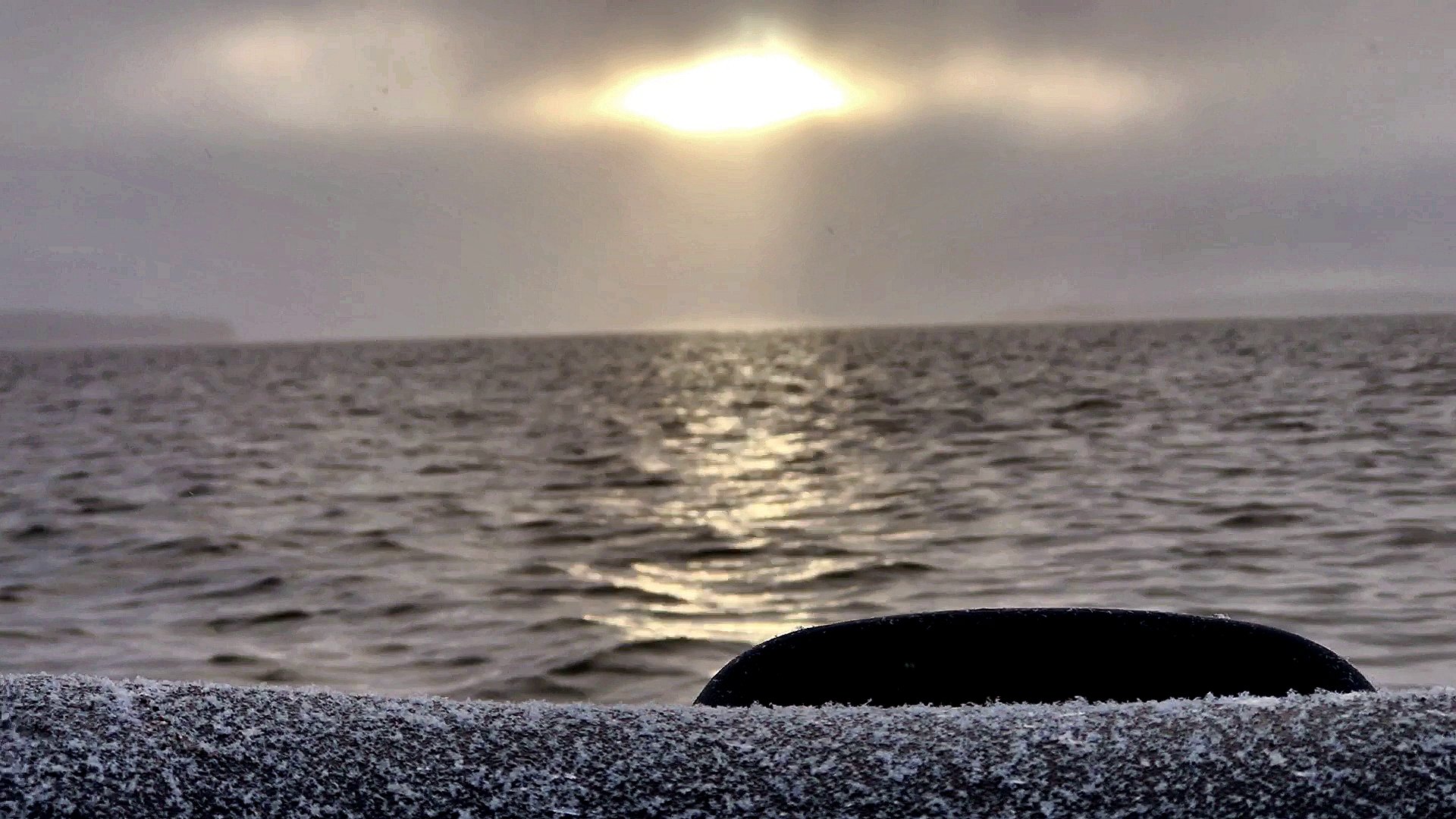 По воде быстро добрались до места лова. Погода была идеальной для этого времени года. Штиль, иногда легкий снежок и небольшой туман. Морозец. Лодка шла под мотором 9.9 около 25 км/ч..