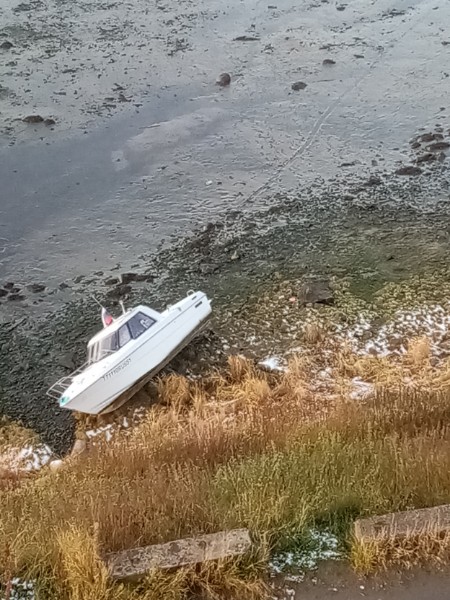 Чей-то катер у Росляково на берегу, может унесло, может так хозяева оставили. На фото не видно,что заякорен или привязан.