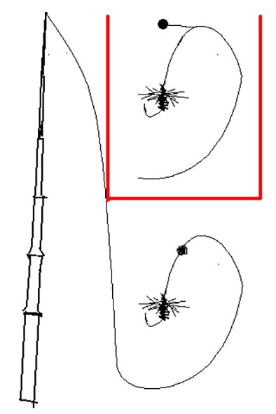 Не вдаваясь во все нюансы. Шнур тут особого провиса не имеет, особенно в подводной части. Тут мушки имеют чрезмерный вес, отчего оснастка не сама катиться, таща у/по дну обе мухи, а ее приходится в определенной степени "поддерживать рукой". Для чего приходится подзадирать палку и не уводить кончик далеко от мух. В результате шнур становится более вертикален, что усиливает горизонтальную составляющую воздействия потока на шнур, но это же и подрывает подводную часть от дна. В результате верхняя нимфа, движется в толще воды, а то и выше - при поимке самой первой рыбы поклевка практически под поверхностью.
