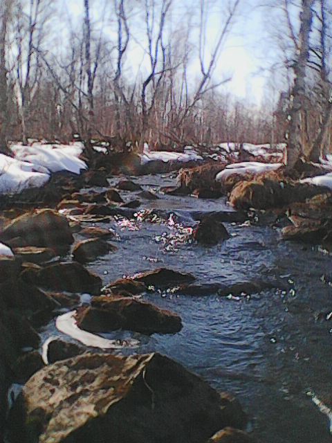 " Лед метр и более. Ручьи вскрыты, ямы с водой и мелкие болотины подмерзли. На второй день слезли пониже в расчете на хариуса, и он таки спас ситуацию. Килушника выложу фото, уж очень красиво лег и парус поднял -и тут я понял, что надо срочно фотать
