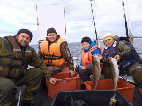 Всем привет! Вот и мы 15 августа вернулись с рыбалки. С погодой повезло! 4 дня выходили в море с утра и почти до вечера. Каждый раз ловили почти по бочке 70 литровой. В результате морозилку 200 литровую наловили. Клевало нормально, по летним меркам. Одна треска на 5 кг, остальные от кг до 4. Сайдочка не плохая ловилась, но мало. Пикша не отставала от трески. Один окунь морской, налимов отпускали. У товарища что-то клюнуло, подняли от дна метров 10 и всё. морской спининг сломали, стали тянуть за верёвку в перчатках, тянули пока шнур не оборвали. Подводная лодка была, наверное. :hi_hi_hi: